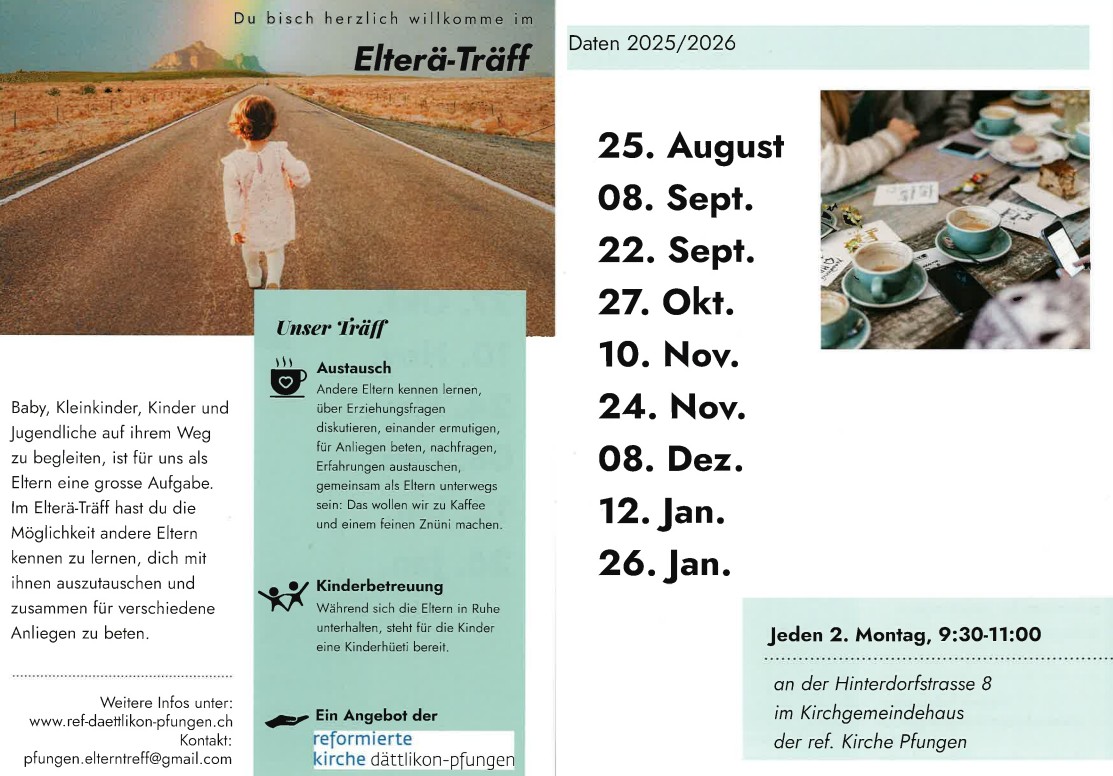 Andere Eltern kennen lernen, über Erziehungsfragen diskutieren, einander ermutigen, für Anliegen beten, nachfragen, Erfahrungen austauschen, gemeinsam als Eltern unterwegs sein: Das wollen wir im «Elterä-Träff». Gerne lernen wir dich an den unten aufgeführten Daten bei einem Kaffee oder Tee im Kirchgemeindehaus kennen. Nicht schulpflichtige Kinder dürfen gerne mitgebracht werden. Während wir in Ruhe austauschen, steht für diese eine Kinderhüeti bereit.