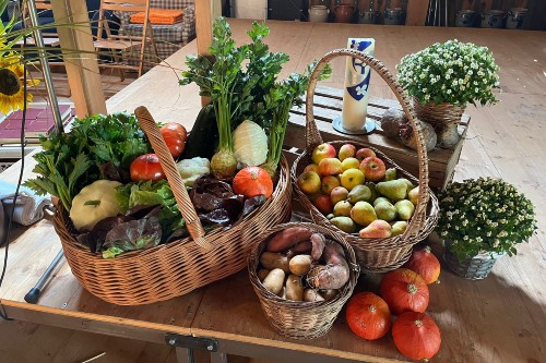 Korbweise farbiges Gemüse, Früchte und Pflanzen wurden von den Landfrauen Dättlikon am Samstag auf den Bungerthof geliefert. Wunderbar anzusehen und in Burgis und Vrenis Händen zu einem wunderbaren Kunstwerk arrangiert. Schnell die Tische und Stühle aufgestellt, die Kaffemaschinen installiert und alles Nötige aus der Kirche und dem Chilechäller angeschleppt. Nach zwei Stunden war eine wunderbare geschmückte Kultur-Schüür bereit für den Sonntagsgottesdienst.